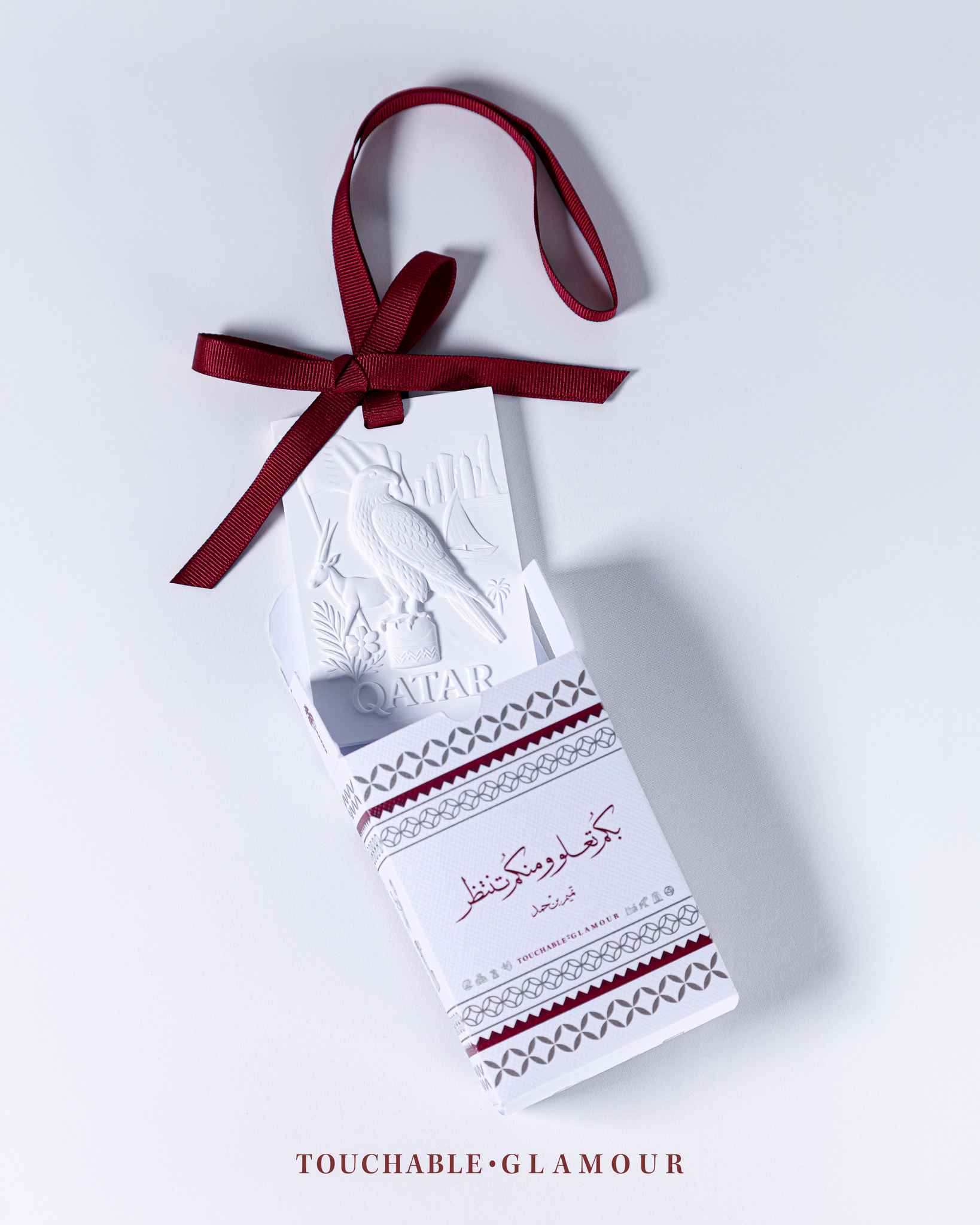 تعليقة سيراميك تحمل بصمة من الهوية القطرية من خلال تفاصيل الصقر، اللنج، السدرة، وأبراج الكورنيش....